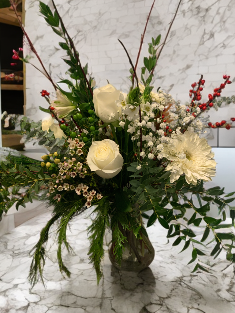 - Materials: White roses, white gerbera daisies, assorted greenery, festive berries, glass vase.